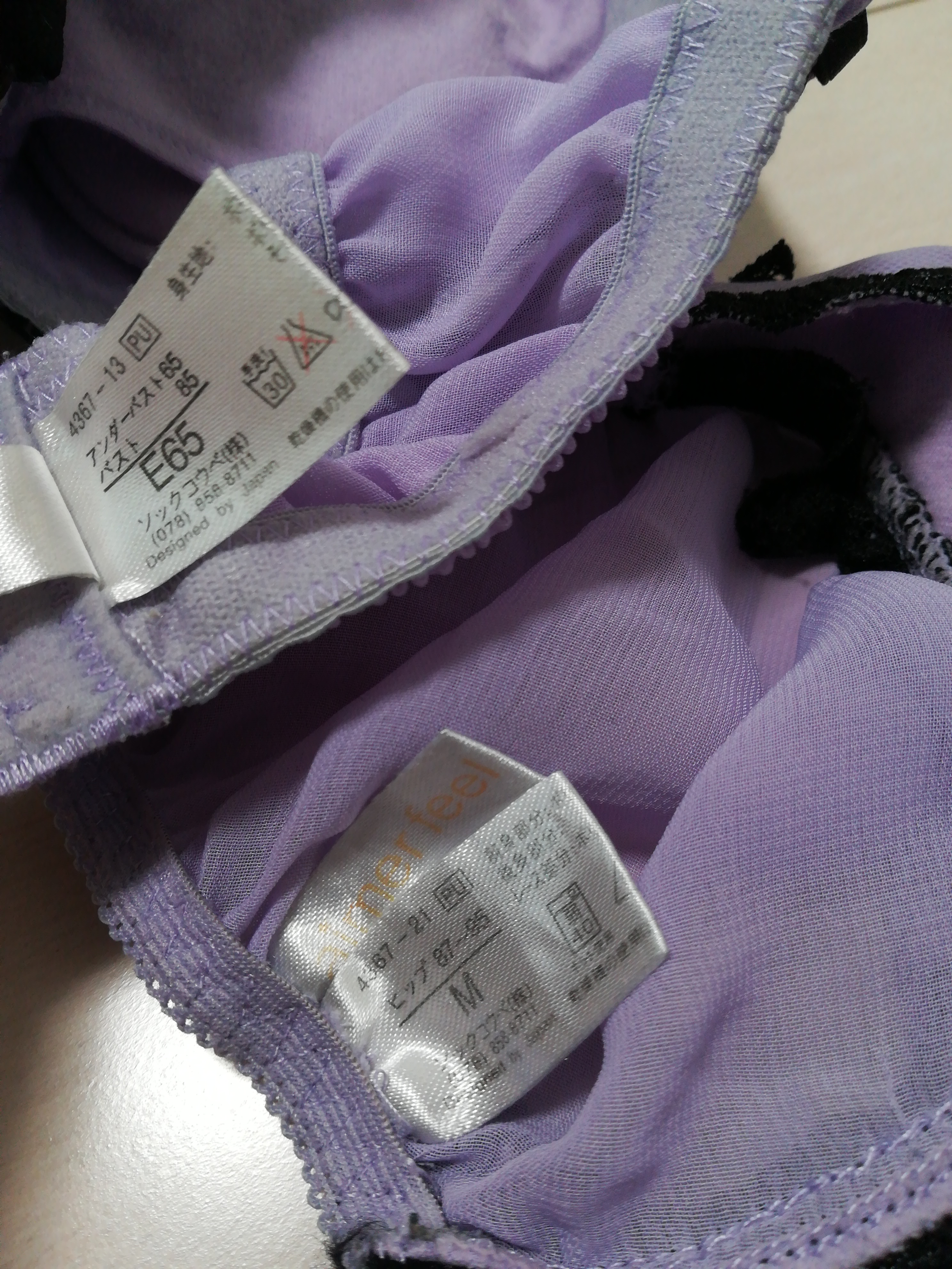 ブラジャーサイズ:E65 パンツサイズ:M ブランド:aimerfeel 可愛いラベンダーカラーにブラックレースがセクシーだよ❤ 嬉しい無料配送✨ 普通郵便にて発送いたします(•᎑•)♪ 追跡番号が必要な方はレターパックを選択してね(o^-^o)