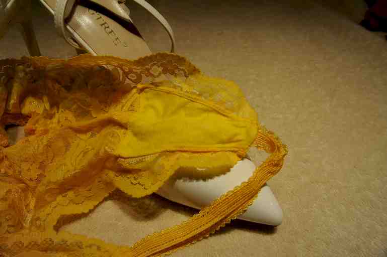 おしゃれで、Hな総レースのお気に入りTバックです。黄色が鮮やかで気分がUP!します。あそこもレースなので、食い込んで沁み込んでいます。えりこの顔写真(無修正)付です。