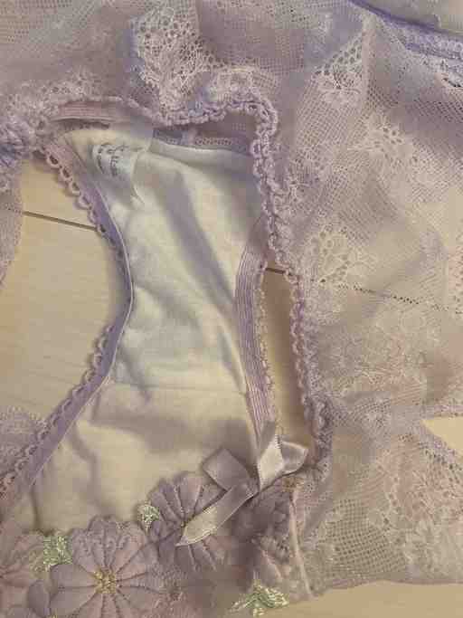 リサマリの淡いラベンダーカラーのブラと、 後ろがレースになっているノーマルショーツです❤️ たくさん着たのでくたっとしてます🥺
